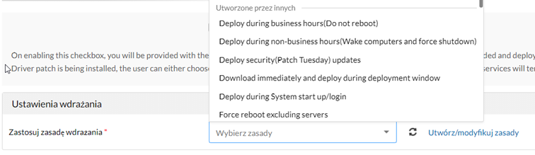 Dodatkowo możemy zdefiniować automatyzację, która po przeprowadzeniu testów i ich pomyślnym przebiegu oraz akceptacji wdroży poprawki w wybranych grupach urządzeń. Możemy określić liczbę dni, po których ma nastąpić wdrożenie oraz godziny, w których ma mieć miejsce instalacja, tak aby nie zakłócać pracy użytkowników.