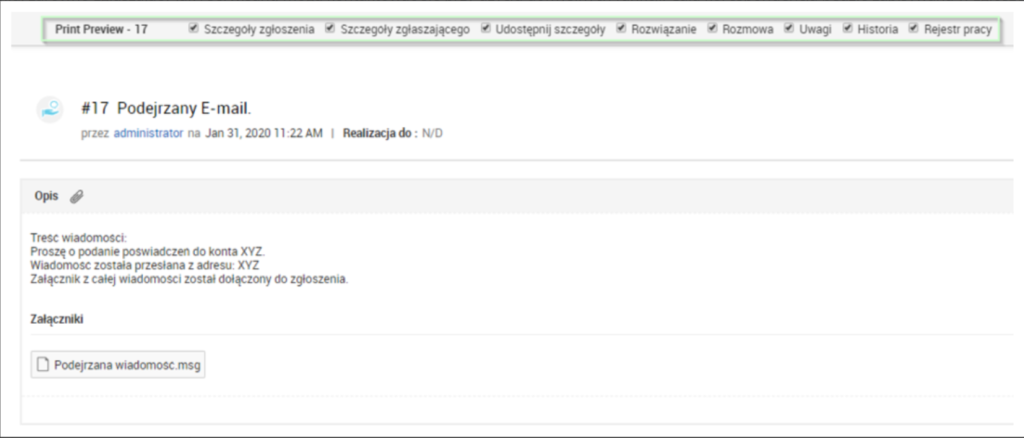 Dodatkowo ServiceDesk Plus posiada opcję „Drukowania” zgłoszenia. Funkcja ta pozwala nam na wybranie modułów, które chcemy wydrukować.