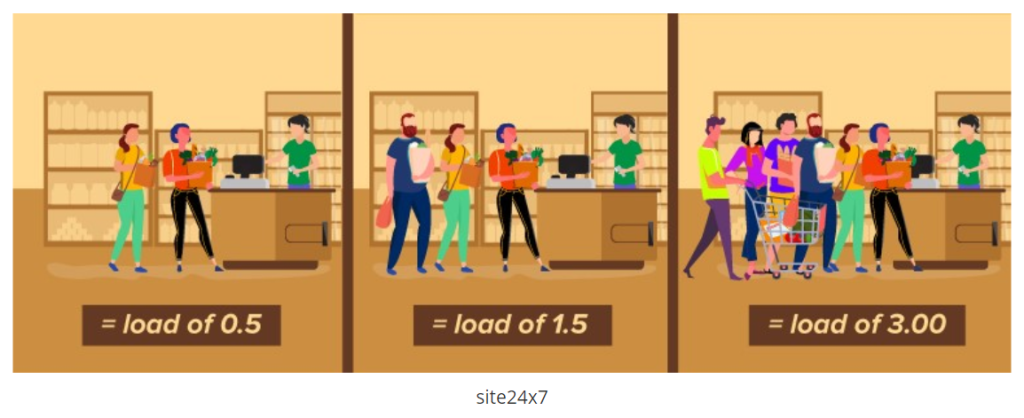 Odwołując się ponownie do przykładu kasjera, obciążenie 1,00 oznaczałoby, że pojemność jest w sam raz na procesorze jednordzeniowym; podczas gdy na procesorze dwurdzeniowym obciążenie 1,50 oznacza, że jedna linia jest zapełniona, a druga linia się zapełnia. Podobnie obciążenie 5,00 na czterordzeniowym procesorze jest czymś, o co należy się martwić, podczas gdy na ośmiordzeniowym procesorze wartość 5,00 świadczy o niewielkim wykorzystaniu zasobów i wciąż dostępnej przestrzeni.