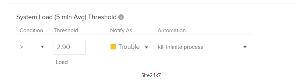 Na przykład, jeśli próg obciążenia systemu jest ustawiony na 2,90 dla procesora dwurdzeniowego, można przesłać skrypt na obciążony serwer lub wywołać polecenia CLI, aby zakończyć proces zużywający najwięcej zasobów procesora, gdy próg zostanie przekroczony. W ten sposób, bez ręcznej interwencji, problem można rozwiązać, a średni czas naprawy (MTTR) zostanie znacznie skrócony.