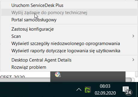 System Desktop Central umożliwia skonfigurowanie portalu samoobsługowego dostępnego bezpośrednio z menu Windowsa: