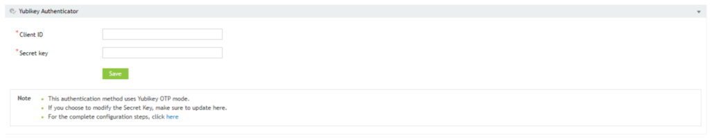 - Przejść do Configuration > Self-Service > Multi-factor Authentication > Configuration tab > Yubikey Authenticator